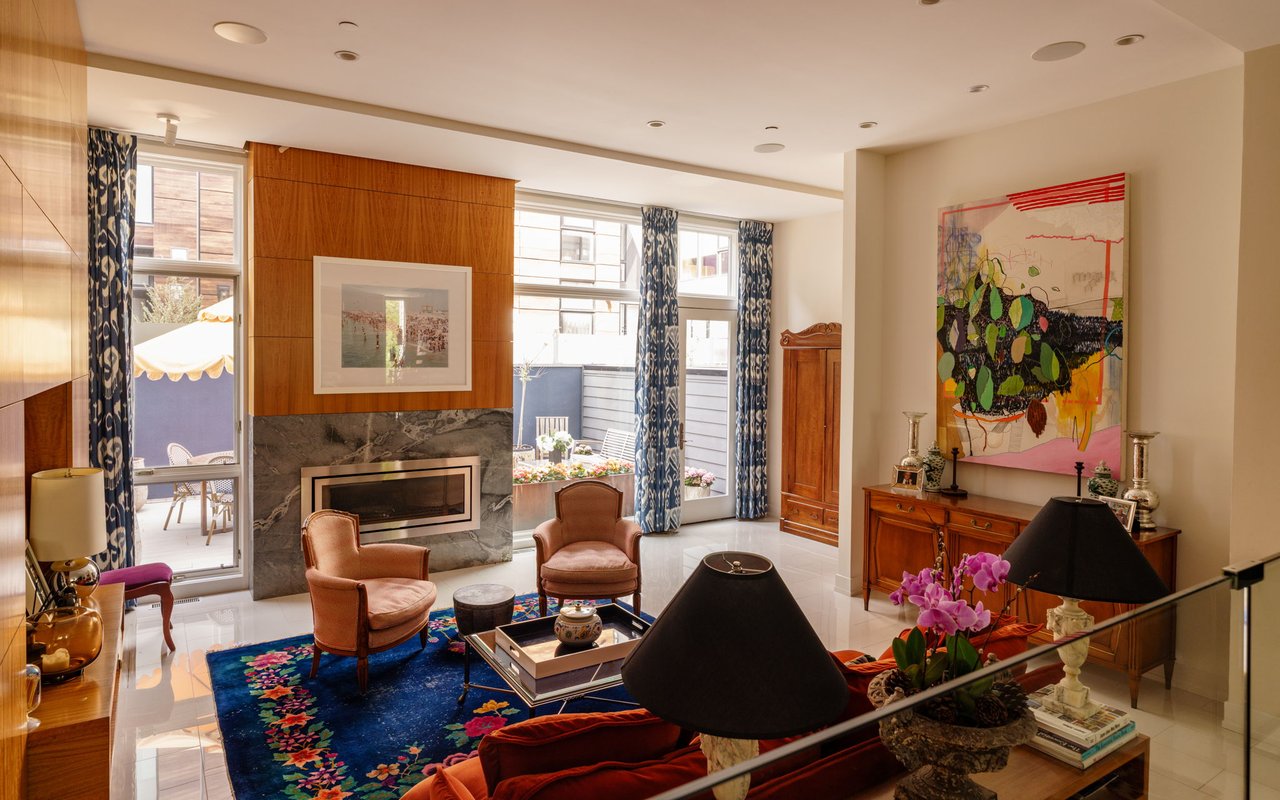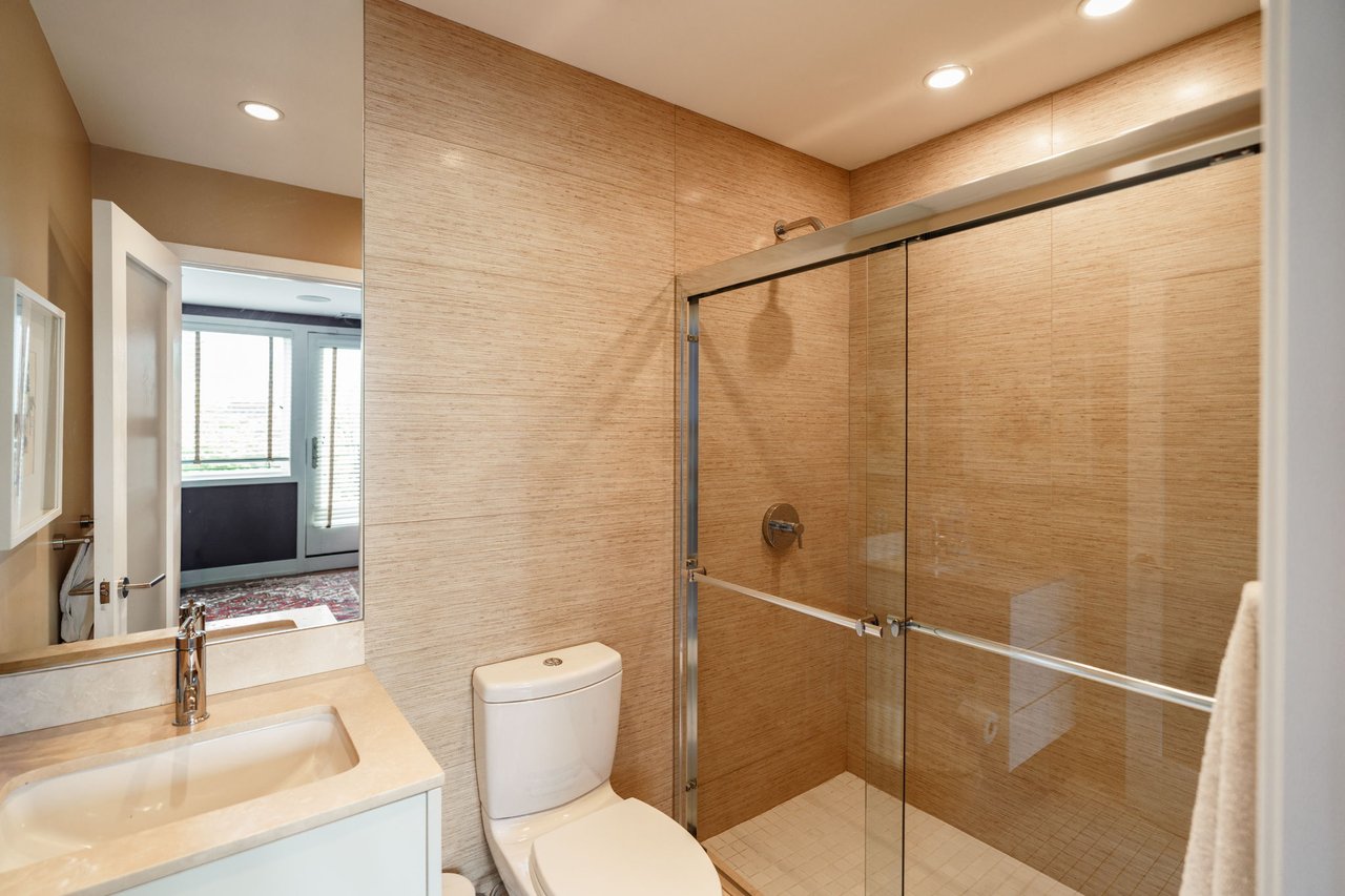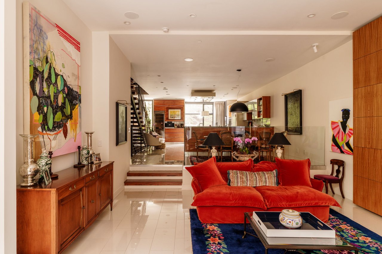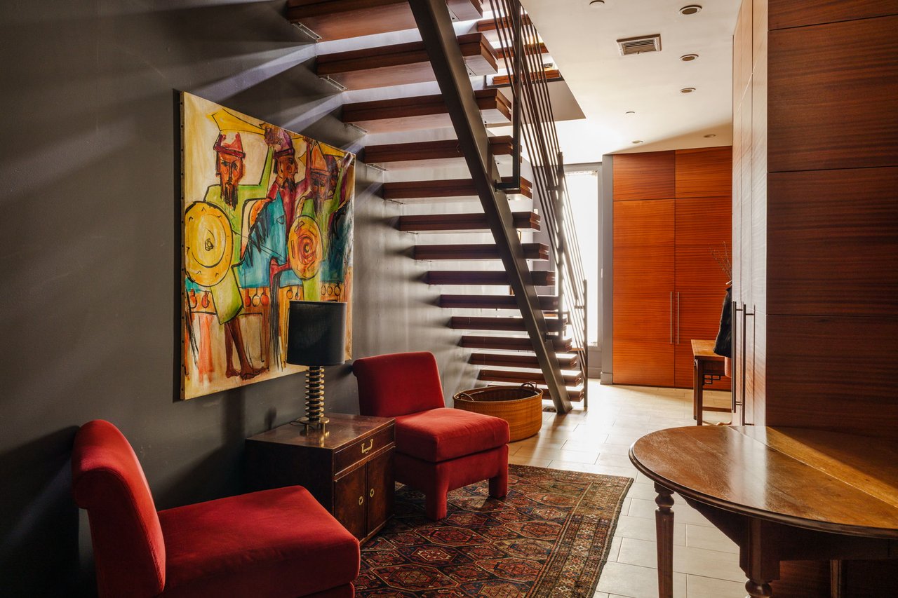 Ascend the open wood-and-steel staircase or board your private elevator to arrive at the impressive entertaining level flanked by dramatic floor-to-ceiling windows. Here, the open-plan layout places inviting seating and dining areas around the spectacular gourmet kitchen. Chic custom cabinetry and beautiful stone countertops surround a fleet of upscale stainless steel Wolf, Sub-Zero and Miele appliances, including a vented gas cooktop, double wall ovens, an oversized refrigerator, two dishwashers, a microwave, a warming drawer, a built-in coffee system, and a large wine refrigerator. Enjoy casual meals and conversation around the waterfall island or plan your next dinner party in the adjacent dining area. Step down to the living room to relax and unwind alongside a linear fireplace. Outside, the spacious second-floor terrace is perfect for al fresco dining and grilling. A convenient powder room and heated floors complete the spectacular main level.