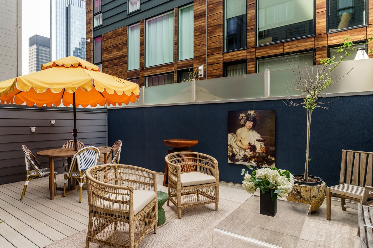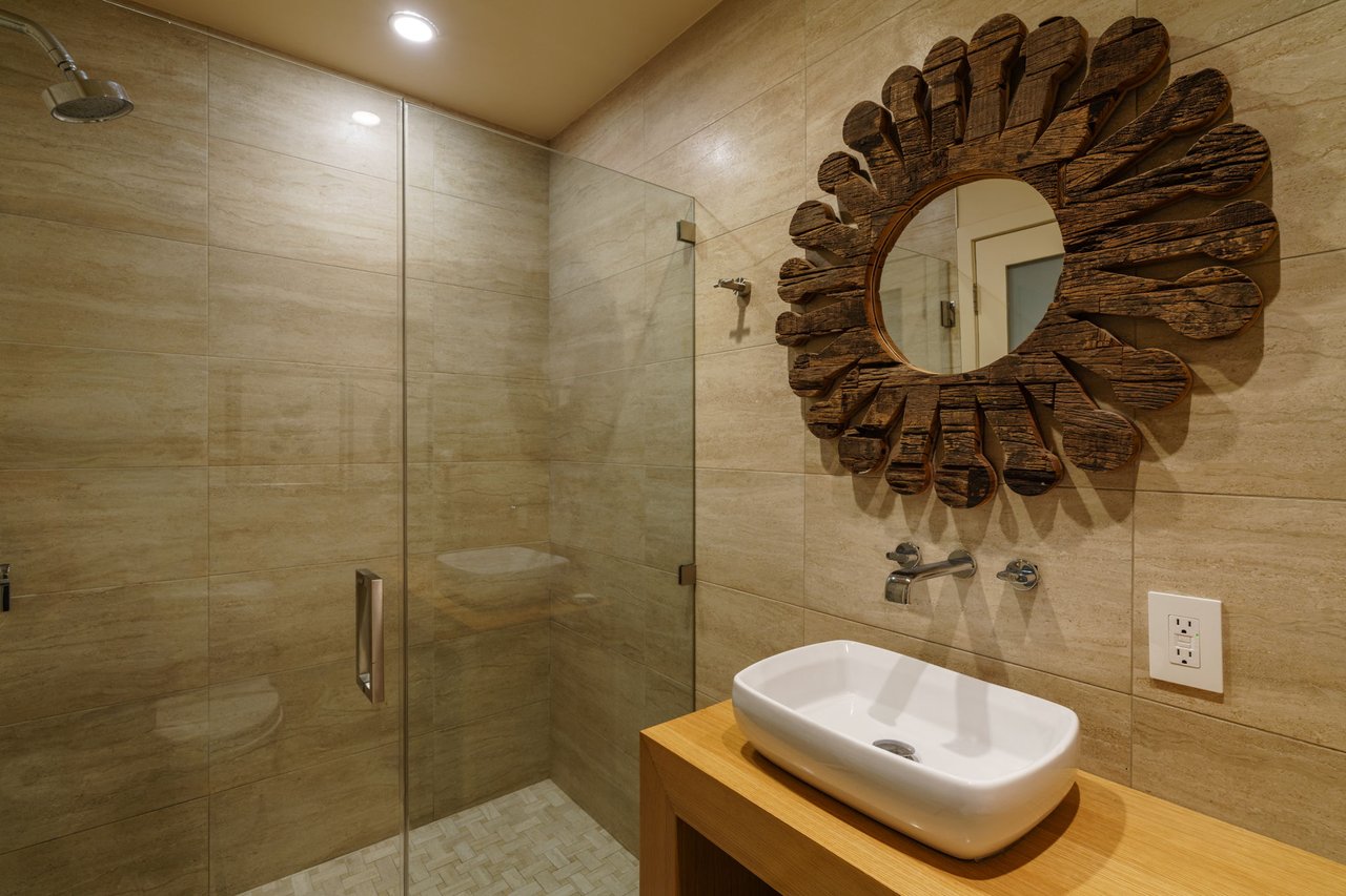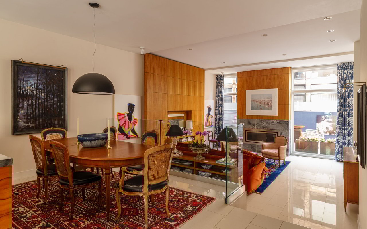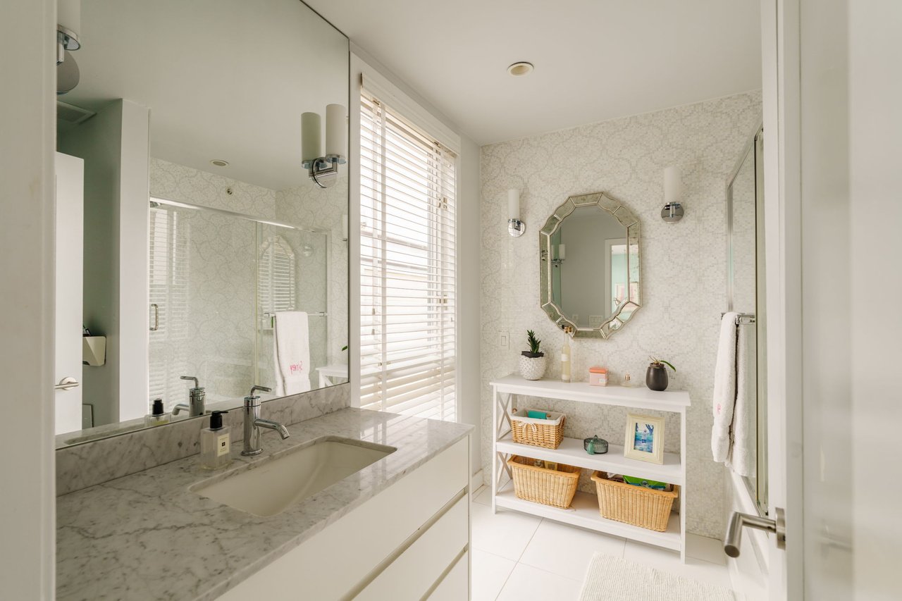 Ascend the open wood-and-steel staircase or board your private elevator to arrive at the impressive entertaining level flanked by dramatic floor-to-ceiling windows. Here, the open-plan layout places inviting seating and dining areas around the spectacular gourmet kitchen. Chic custom cabinetry and beautiful stone countertops surround a fleet of upscale stainless steel Wolf, Sub-Zero and Miele appliances, including a vented gas cooktop, double wall ovens, an oversized refrigerator, two dishwashers, a microwave, a warming drawer, a built-in coffee system, and a large wine refrigerator. Enjoy casual meals and conversation around the waterfall island or plan your next dinner party in the adjacent dining area. Step down to the living room to relax and unwind alongside a linear fireplace. Outside, the spacious second-floor terrace is perfect for al fresco dining and grilling. A convenient powder room and heated floors complete the spectacular main level.