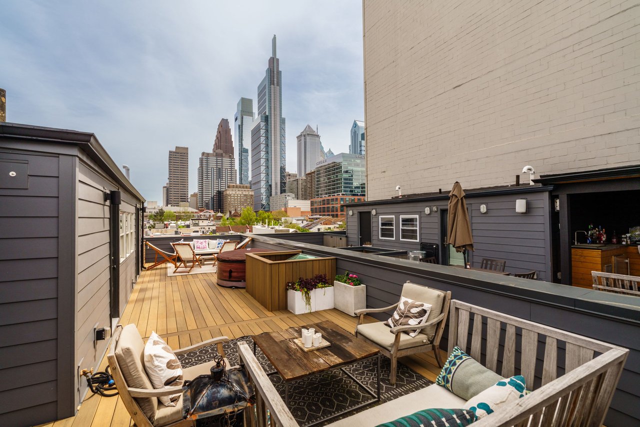 This home’s crowning glory is its magnificent top floor, featuring a powder room and a handsome kitchenette stocked with a refrigerator, dishwasher, kegerator and sink. Outside, your glorious roof deck invites you to bask in breathtaking panoramic views from multiple seating and dining areas. A hot tub and sauna create an unrivaled spa-like retreat in this turnkey Philadelphia showplace.