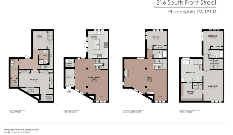 A true showpiece, this sprawling renovation sits at one of the most coveted tree-lined corners in Society Hill, and offers myriad amenities, down to the 3+ car covered parking with direct access from the finished lower level. The sweeping living/dining area on the first floor opens to a handsome chef's kitchen, clad in teak, granite, and limestone, and with the requisite Wolf and SubZero appliances, that overlooks a splendid private patio garden. The second floor's grand family room, trimmed with an elegant custom wet-bar and gas fireplace, is large enough for two comfortable seating areas and leads to a sun-splashed bedroom with lovely three-piece bath and custom closet. The impressive master suite on the 3rd floor includes a magnificent marble bath and a jaw-dropping custom walk-in closet with massive amounts of storage and smartly placed laundry facilities. A third bedroom completes this floor, with its own exquisite en-suite bath and custom closet. The finished lower level of this substantial townhouse offers tons of storage and great space for a home office or gym, a fourth full bath, a custom wine cellar, and direct access to deeded parking for three+ cars. This pristine home is perched on a quiet corner, with private access to Penn Landing Square's manicured grounds and fabulous pool, and is still just steps away from some of the best restaurants and shopping that Center City has to offer.