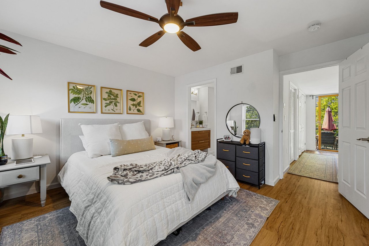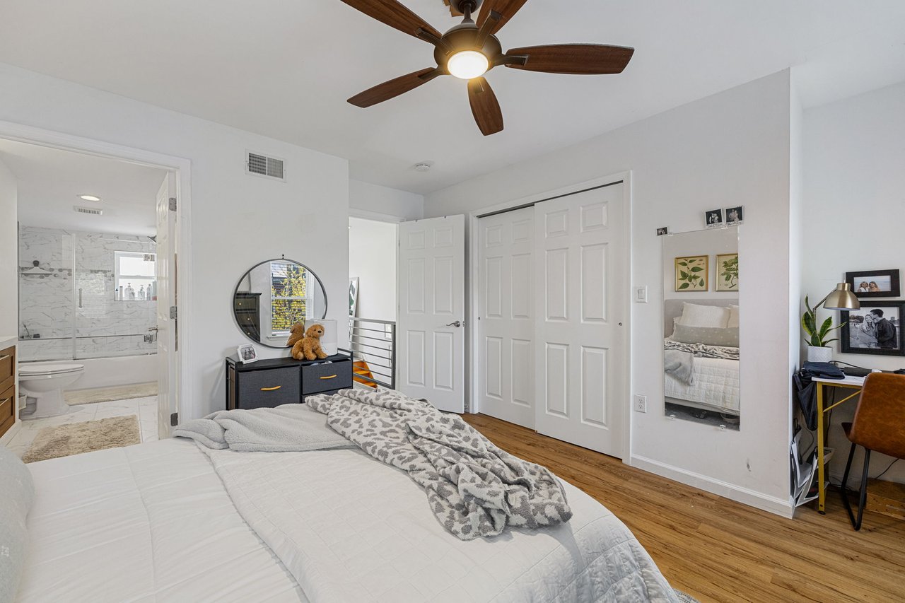 The second unit begins on the second floor, where you’ll find a sunlit living space, a full bathroom, and a cozy bedroom. Ascend to the third floor to discover a private roof deck surrounded by lush greenery—ideal for al fresco dining or relaxed entertaining. Both outdoor spaces have water and electric hookups. This level also includes a full laundry closet and a spacious primary suite, complete with a king-sized layout and a luxurious en-suite bathroom.